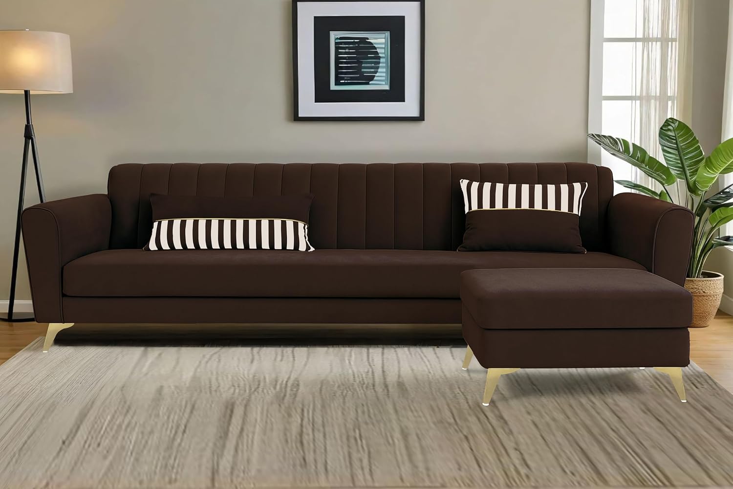 Adorn India Premium Luster 4 Seater L Shape Sofa Set | Velvet Suede Fabric | 3-Year Warranty | Color Grey Brown with Golden Legs & Striped Pattern Cushion