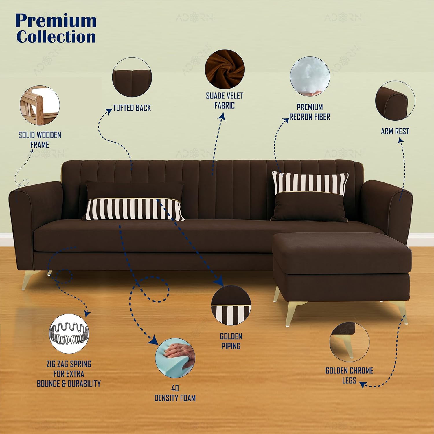 - Upgrade your living space with the Adorn India Luster L-Shape 4-Seater Sofa. Crafted with a solid wooden frame, this premium sofa features a tufted back, suede velvet fabric, and plush 40 density foam for unmatched comfort. Enhanced with golden piping, chrome legs, and zig-zag springs for added durability, it's filled with premium Recron fiber and includes armrests for optimal support. Style meets luxury.